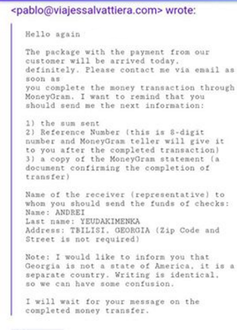 We are still awaiting the initial recruiting emails from the victim that alerted us to this scam and will update this post as soon as we receive them. However, we do have a screenshot of the actual email in which the scammer instructed the victim where and to whom to wire the cash!